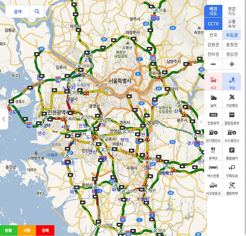 ▶ 왼쪽에서 사고, 정체, 작업 관련 내용을 확인할 수 있으며, 오른쪽에서 지도상에 CCTV, 휴게소, 우회도로 등을 표시하는 옵션이 있습니다. 지도에서는 "원활", "서행", "정체" 구간을 색상으로 표시해 줍니다.